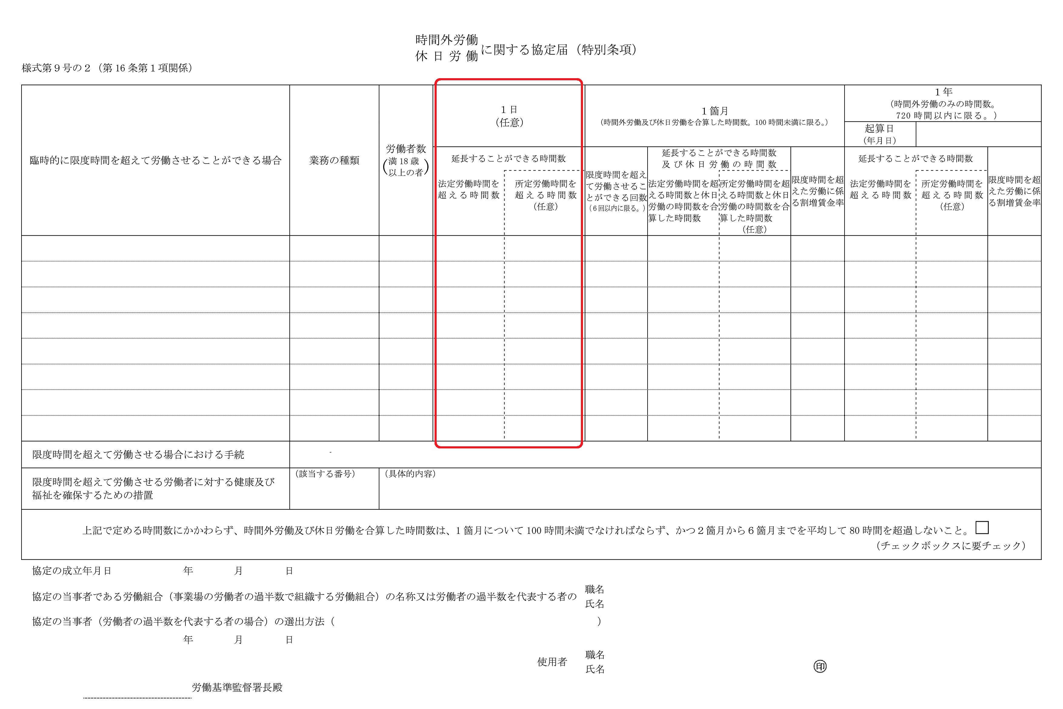 法改正が行われる以前の旧書式では、特別条項における1日の上限時間は存在しませんでした。つまり、特別条項の具体的事由に該当すれば、いくらでも時間外労働(物理的には15時間)が可能でした。しかし、この度の法改正により、「記載がなければ1枚目の時間」「記載があれば2枚目の時間」といった具合に、時間の縛りができました。これは、時間外労働に対する時間管理が厳格化したことを、意味しています。「1日(任意)」という4文字、ここに込められた意味は大きいですね。